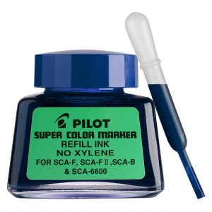 Pilot Super Colour Permanent Marker Blue 30ml Refill (SCA-RF-L) SCA-RF 30ml ink refill bottle for Pilot SCA Jumbo, Bullet and Chisel aluminium-barrel permanent markers. Strong colour and quick-drying permanent ink. Complete with eye-dropper tool. Blue ink. Purchase 12 to receive a box.